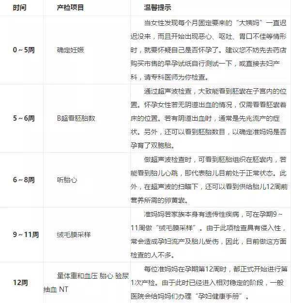 孕早期主要是确认受孕、查验胚胎数、听胎心、绒毛膜采样(遗传病检测)和第一次产检。孕妇在12周前,到医院领取“孕妇健康手册”(全国各地叫法略有出入)建卡,准妈妈们记得领取,不要忘记哦。