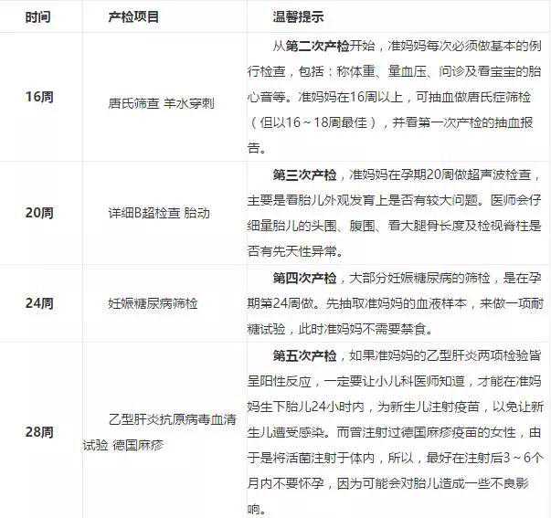 孕中期需要做五次产检,常规例行检查有称体重、测血压、问诊和听宝宝胎心等。而较为重要的几项则是唐氏筛查、糖尿病筛查、乙肝检查。