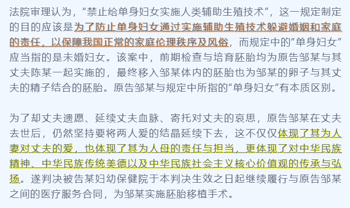 随后,法院审理认为,「禁止给单身妇女实施人类辅助生殖技术」,这一规定制定的目的应该是为了防止单身妇女通过实施辅助生殖技术躲避婚姻和家庭的责任,规定中的「单身妇女」应当指的是未婚妇女。