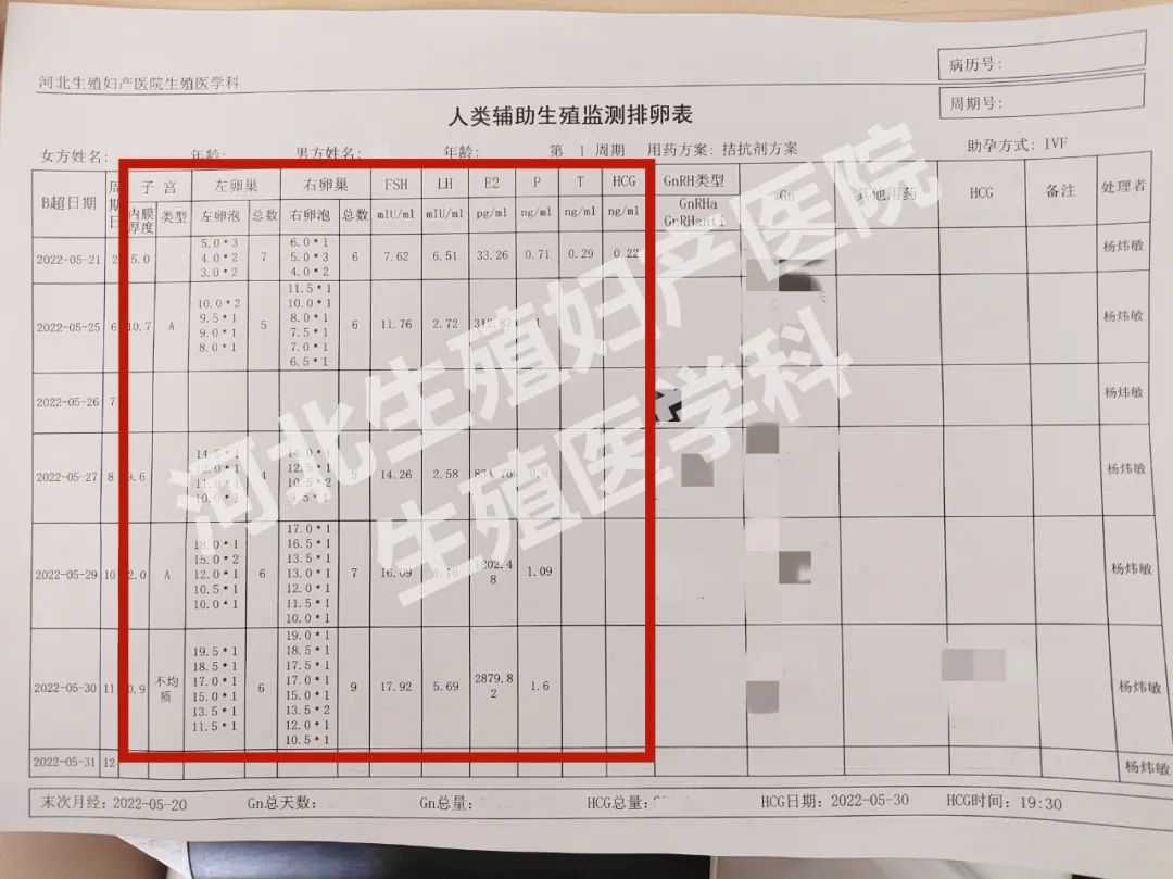 表格中间部分为医生记录的本次周期的相关数据,包括卵泡直径大小及个数、子宫内膜厚度、相关性激素的数值等。