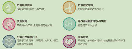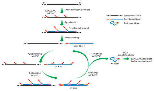 MALBAC:(multipleannealingandlooping-basedamplificationcycles)即:多次退火环状循环扩增技术,为最先进的单细胞全基因组扩增技术。该技术通过采用特殊引物,利用独特的具有链置换活性的DNA聚合酶,使得扩增子的结尾互补而成环,从而达到近乎线性的预扩增,有效提高均一性及覆盖度,降低等位基因脱扣率,再通过PCR进行指数式扩增,极大提高扩增效率,单次扩增产物可达2-4µg,能为下游分析提供充分的实验材料。其原理图如下: