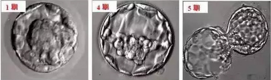 第一张(左)图片为一个1期的囊胚,第二张(中)图片为一个4期囊胚,级别记为“4AB”,第三张(右)图片为一个5期囊胚,级别记为“5AA”。