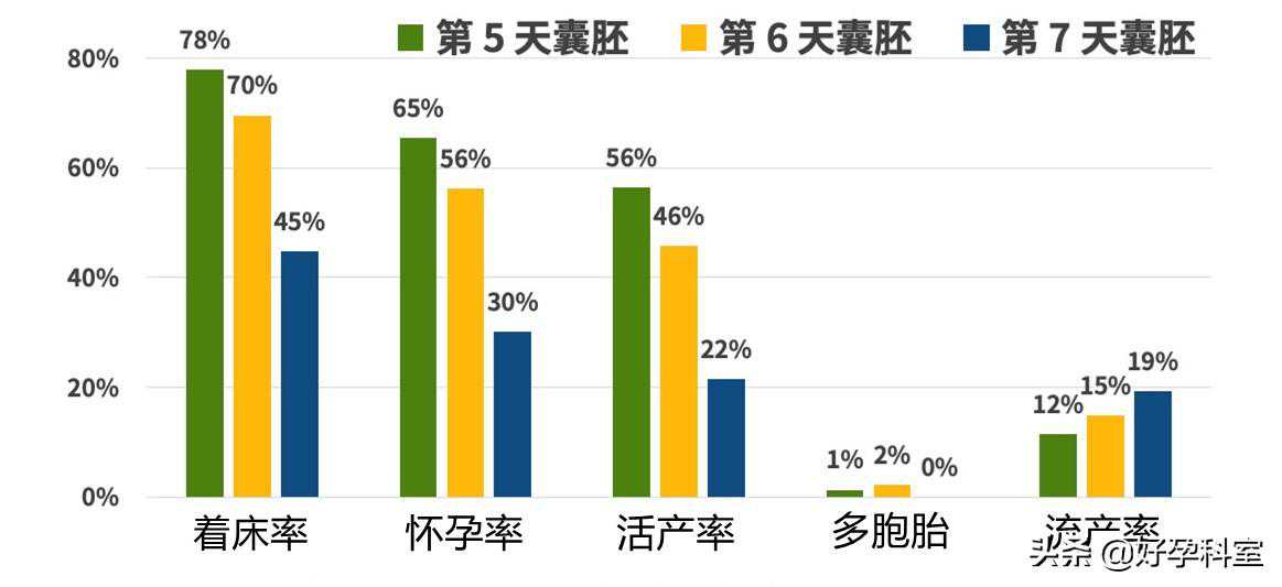 第五天、第六天染色体正常囊胚植入后,着床率70%以上、怀孕率50%以上、活产率45%以上、流产率大约12%到15%。