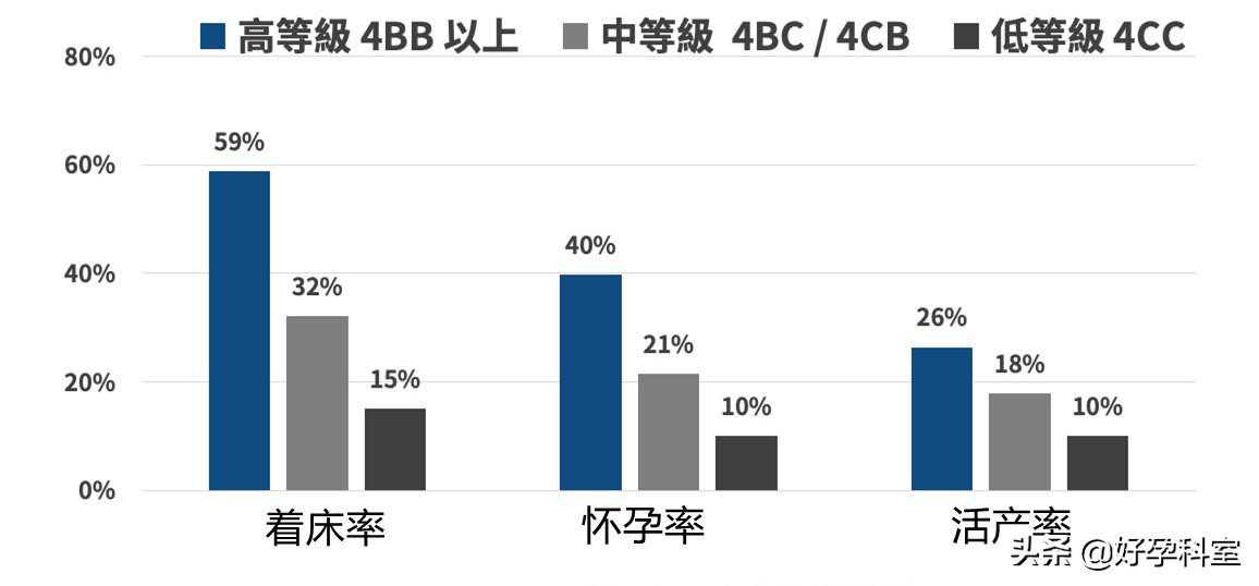 如果是中等级的4BC或4CB,着床率就稍低32%、怀孕率稍低21%、活产率低18%;如果是低等级的4CC,着床率就更低15%、怀孕率很低10%、活产率很低10%。