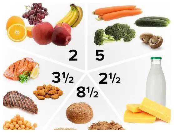 对于一位孕妇来说,良好的膳食比例如下图所示,其比例大致是:2份水果;5份蔬菜;2.5份乳制品;8.5份谷物;3.5份瘦肉、坚果和豆类。